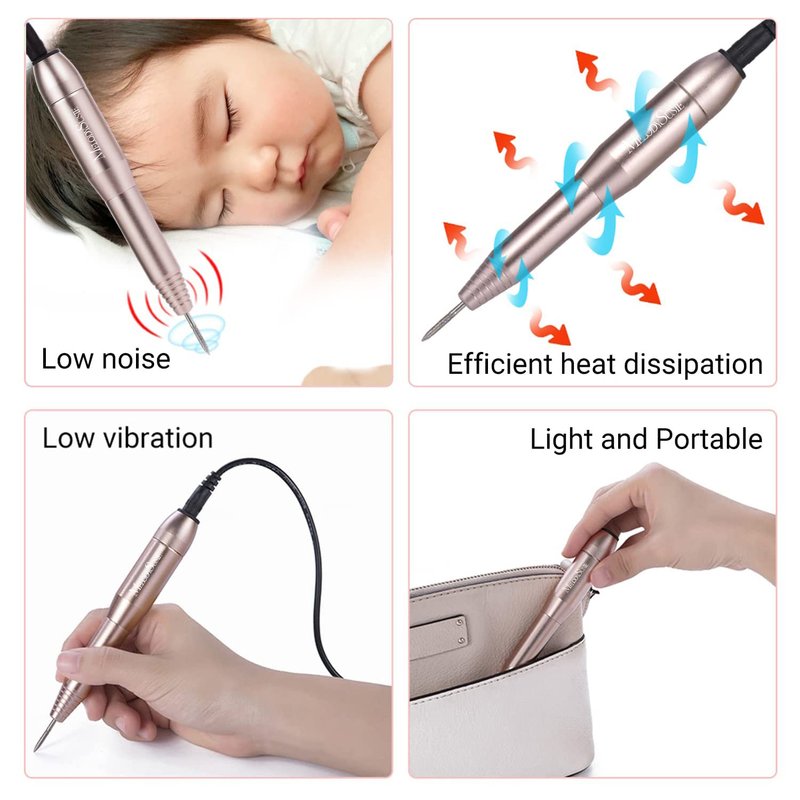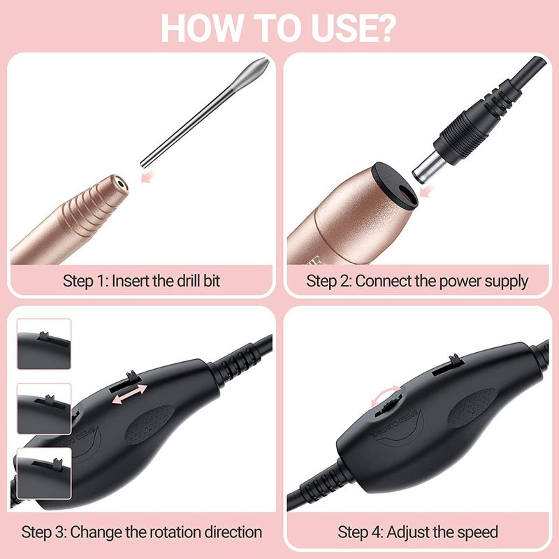 The MelodySusie nail drill is an all-in-one nail maintenance device that allows you to “bring your beauty salon home” and do your own manicures. Functional, versatile, and easy-to-use, it's an essential tool for nail-care veterans and newcomers alike. 1. This nail drill is designed for acrylic gel nails. So if you want to remove the gel polish of natural nails but you are not a professional manicurist, please use the nail polish remover pads instead of a nail drill to avoid damage to the nail bed. 2. In order to meet the requirements of professional manicurists, this product is designed to have an adjustable rotation speed of 0-20000 rpm. Please slowly adjust it from low speed to a higher speed that you like when you are using it. Do not adjust it to the highest speed all at once to prevent the improper operation from hurting your nails. 3.A high-speed motor will inevitably generate heat, so please do not use the nail rill for too long each time. When you feel that the nail drill is overheated, please stop using it immediately and wait for the heat to dissipate before using it again. (no more than 20 minutes of continuous use each time is recommended) 4. Please use the adapter in the original package. When the nail drill is rotating, please turn off the switch before replacing the nail drill bit. 5. Please do not pull the power cord or let the device drops or by other impacts. 6. Please do not use the device when the connecting wires broke and do not touch the plug with a wet hand to prevent electric leakage and shock or fire. Do not operate in wet or moist conditions/Only a dry cloth is allowed for cleaning.
