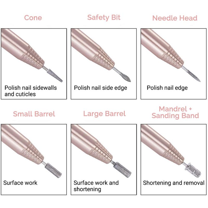 - PC120B Multifunctional: Designed with 6 kinds of metal bits (also works with all kinds of 3/32" shank bits) and 6 sanding bands, which are used for grinding, carving, cutting, polishing for all nail arts as well as cuticle removal