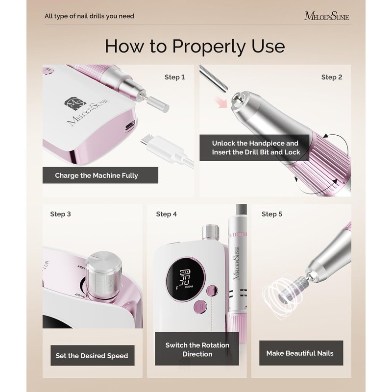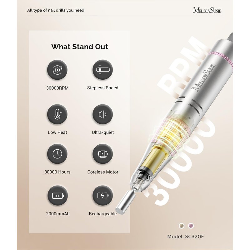 MelodySusie Portable Nail Drill 30000 RPM,SC320F Professional Rechargeable Electric Nail File,Cordless Nail E File for Acrylic Nails Gel Polishing Removing,Efile Nail Kit for Manicure Salon Home,Rose