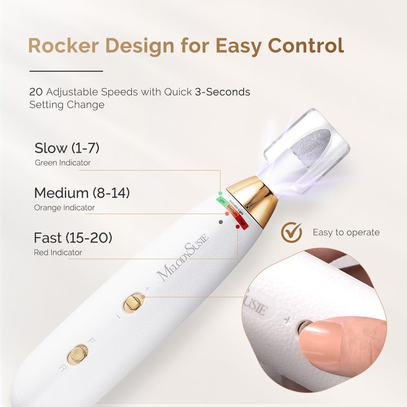 - Rechargeable & Cordless Nail File: Featuring MelodySusie’s latest textured grip and convenience, it features a high-capacity battery and USB Type-C charging, providing up to 4 hours of continuous use. Perfect for on-the-go nail care, it ensures powerful performance without the hassle of cords.