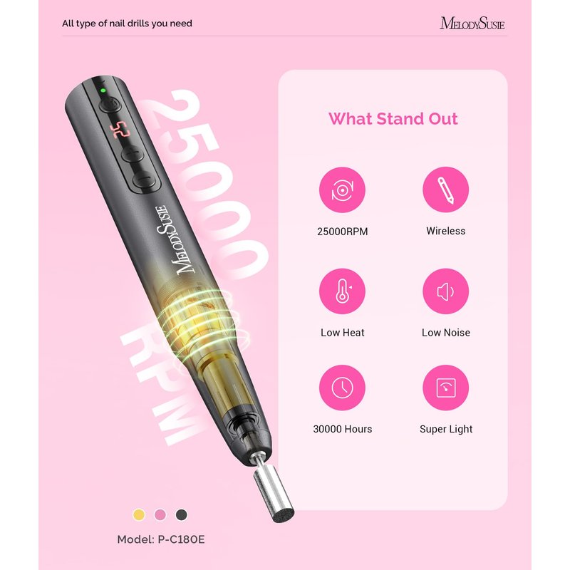 MelodySusie Rechargeable Cordless Electric Nail Drill,PC180E 25000RPM Portable Nail Efile for Acrylic Gel Dip Powder Nails, 25 Speeds with Nail Drill Bits Sanding Bands Gray