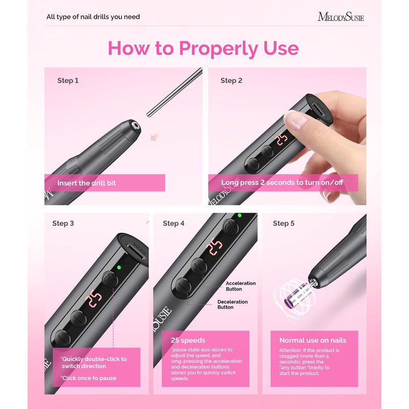 - 25 Adjustable Speeds, Reversible Direction: 25 adjustable speeds 6000-25000rpm, pause function and F/R direction function for right or left handed use, manicure and pedicure can choose different speeds. Multi-functional manicure kit is a perfect gift for nail art lovers.