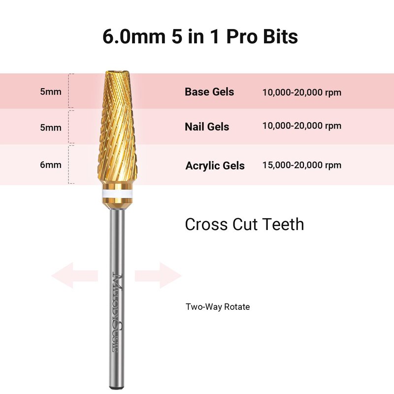 - Upgrade 5 in 1 Pro Cross Cut Carbide Nail Drill Bits | Color: Gold | Grit: XC+M+3XF | Shank Size: 3/32'' | Two-Way Rotation.