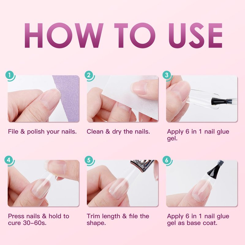 - 6 IN 1 Glue: Multi-function which combines gel nail glue, base gel, blooming gel, nail slip solution gel,strengthener,nail art glue gel. One gel fix all nail work