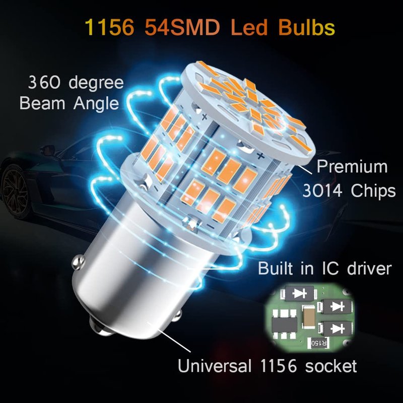 - Specification: 2pcs 1156 bulb with 54smd 3014 led chips, Length:1.4” 35.8mm, Diameter: 0.71” 18.2mm , Amber light,, Voltage: 12-24V, Wattage: 3w.