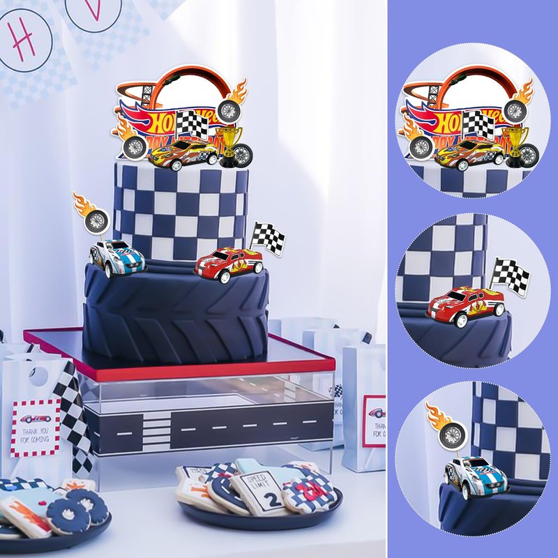 - 【Racing Car Birthday Cake Decoration Set】:Package Comes comes with 24pcs racing car cake decorations include 4pcs racing car cake topper measured 2.76 × 1.29 inches, 4pcs wheels with two sizes, 10pcs Checkered racing flag Cupcake Toppers, 1pc big car happy birthday cake topper, 1 gold trophy cake topper, 4pcs flame tires cake toppers. Enough for your car themed party decorations.
