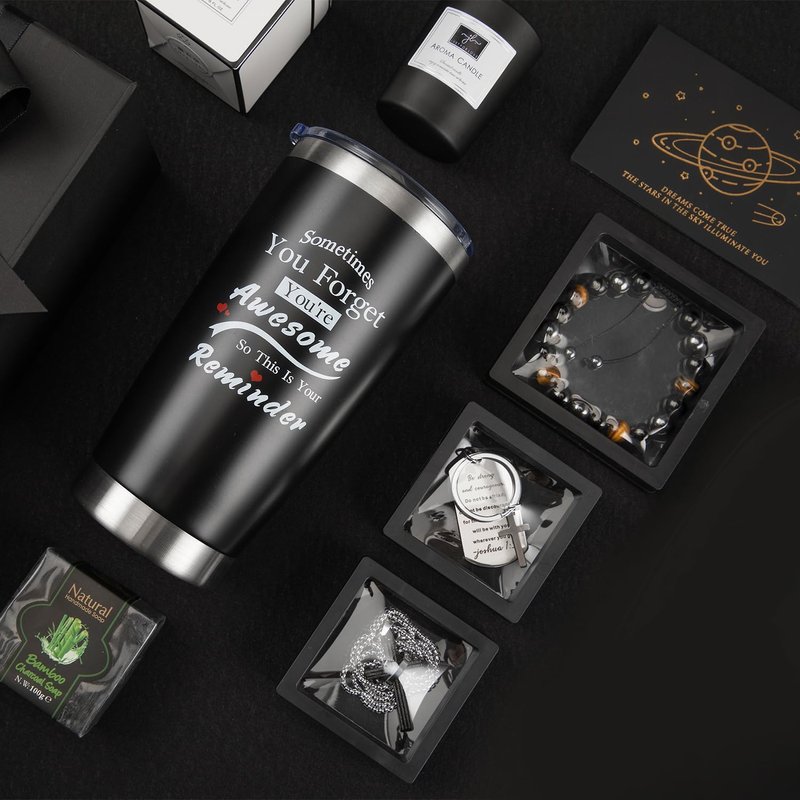 - 【Gift Box Package】:The gifts set comes with Insulated Tumbler , Men's Bracelet,Pure Manual Soap ,Scented Candle,Cross Necklace,Keychain,Greeting Card, Exquisite gift box and some accessories such as lid, straws. This men gift set is a wonderful gift to satisfy your giving gift needs and the practical dad gifts set will make him happy and heat- warming.