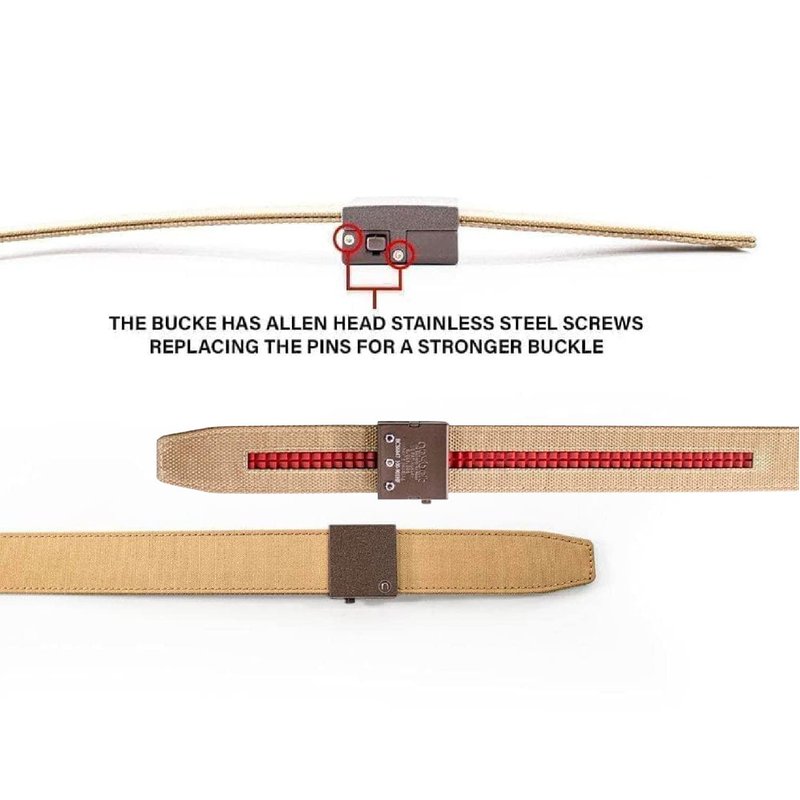 - STRONG STABLE SET SCREWS - The clasp has 3 set screws to give a more reliable hold than just a clasp alone (a Nexbelt exclusive). Constructed using stainless steel set screws, and NOT pins, like cheap others (patent pending). Belt Buckle size is 1 ½ x 1 11/16”.