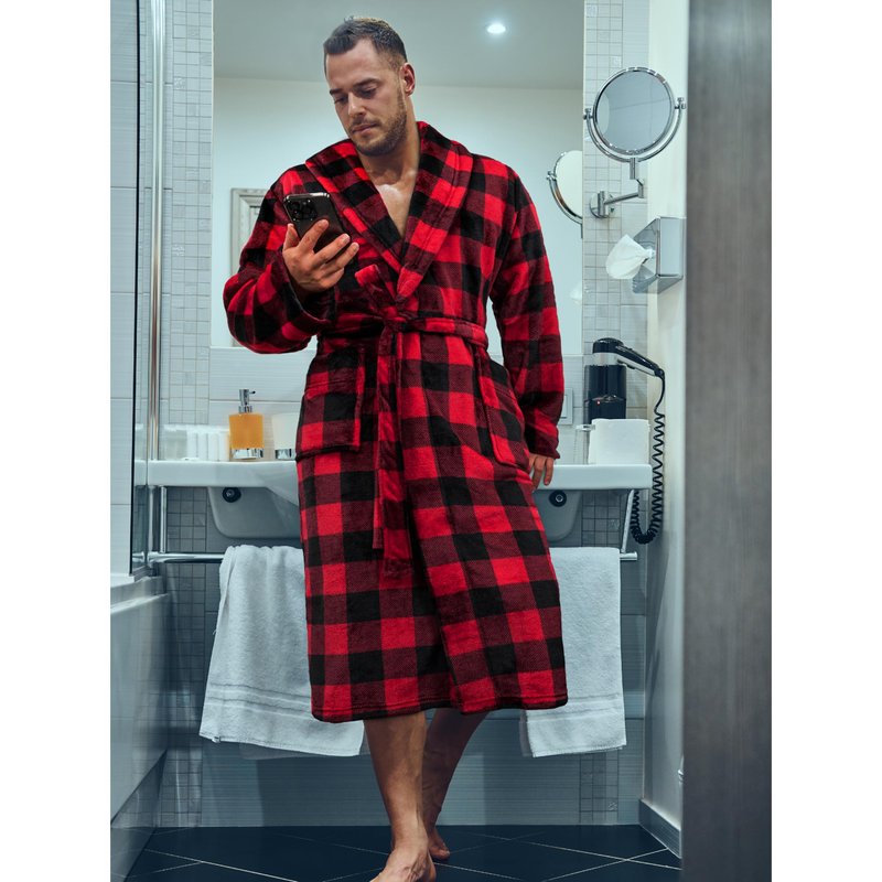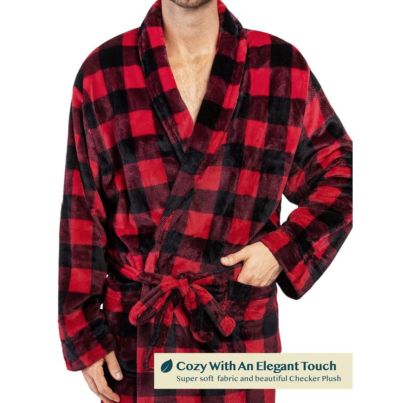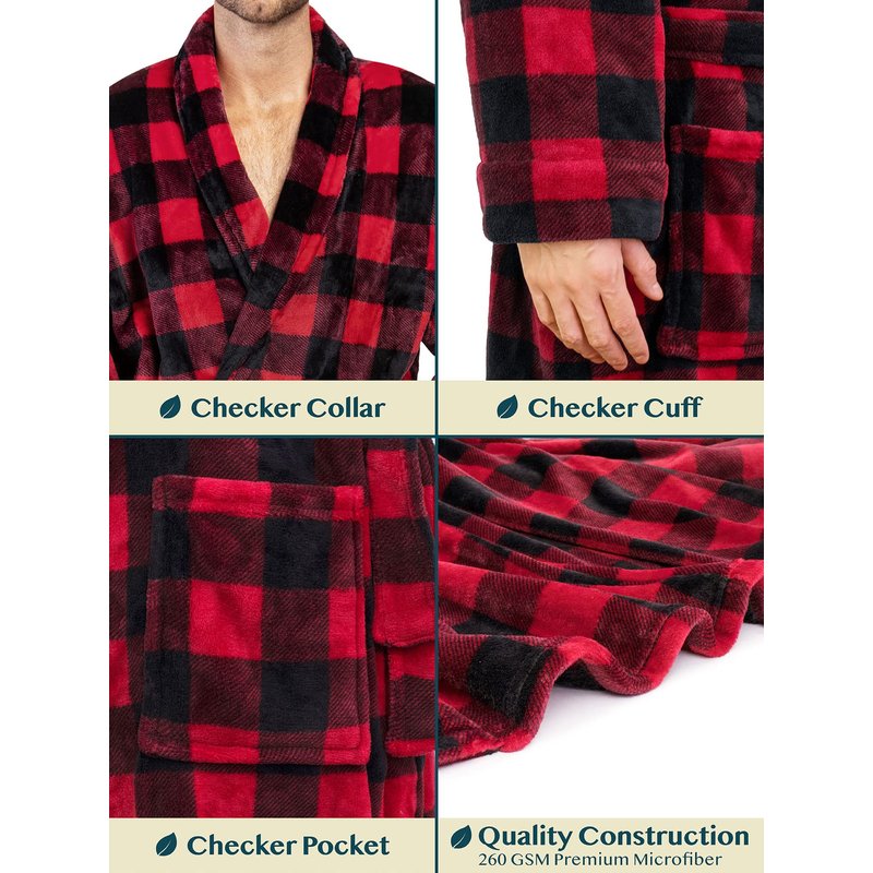 - FLANNEL BUFFALO CHECKER ROBE: This ultra soft men's robe features a plaid checkered design and has silky microfiber fabric to envelop you in luxurious comfort for the ultimate relaxation experience. The microfleece material is soft and smooth to the touch and great for lounging and napping. This plush shower bathrobe for men is lightweight, breathable, warm, and comfortable. Perfect robe for cold winter nights and light enough for everyday all season use even in the summer.