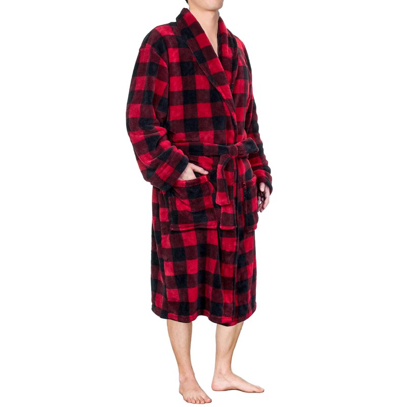 - SOFT PLAID MENS ROBE: Enjoy the comfort of a warm, plush, fleece microfiber with our lightweight breathable, and cozy mens robe. Designed with a winter holiday buffalo checker print, this comfortable bathrobe is perfect for relaxing at home after work, shower, bath, nap, pool, or spa. Long sleeve robe nightgown can be used as sleepwear, pajamas, changing clothes, pjs, hospital gown, or mens housecoat. Mid length robe comes with a waist tie so you can adjust for your perfect fit and side pockets.