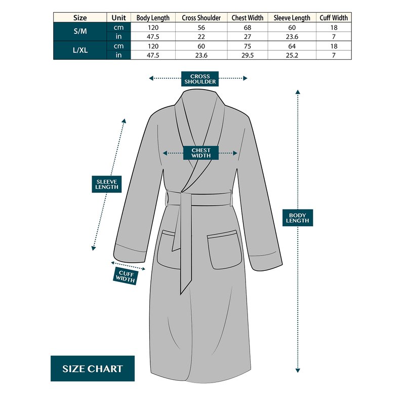 - MACHINE WASHABLE ROBE- Easy to care for male robe. Machine wash with like colors in cold water, and tumble dry low; Made of 260 GSM 100% Microfiber Polyester. ONE SIZE FITS MOST - Overall Length: 47.5 in | Shoulder: 23.6 in | Sleeve Length: 26 in | Cuff: 7 in |
