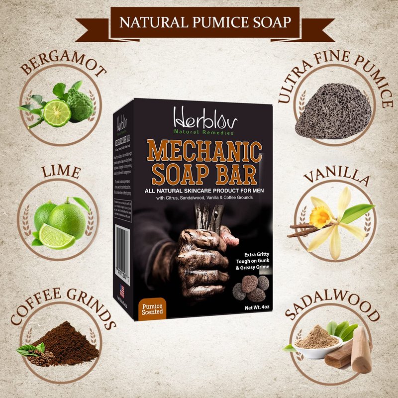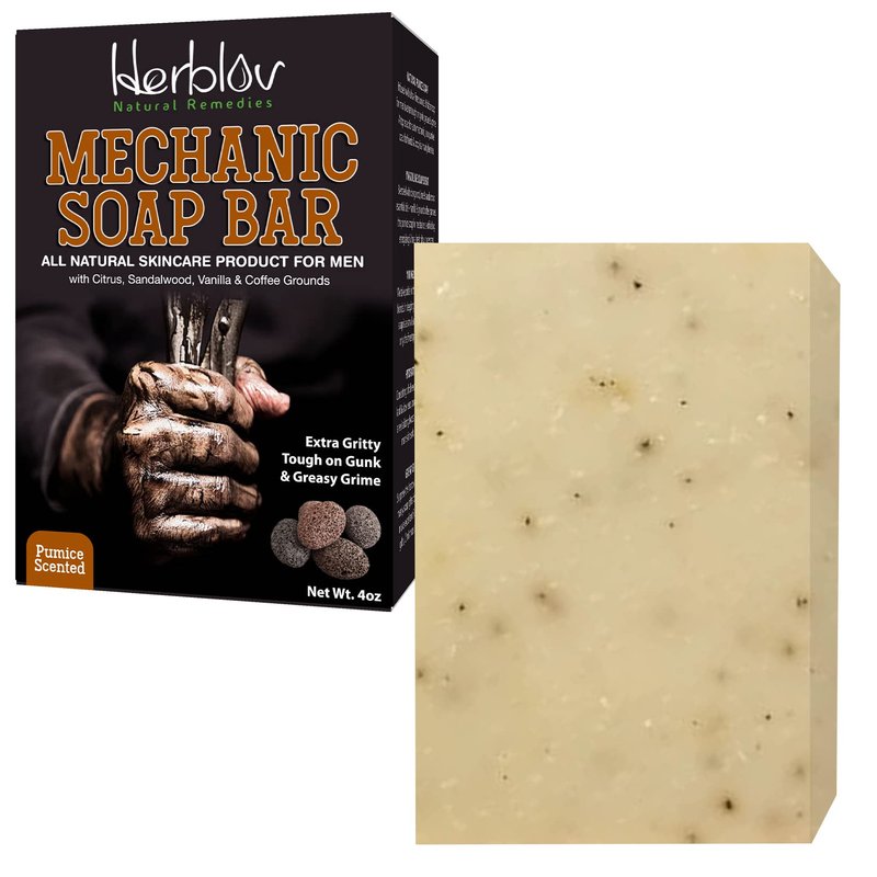 - NATURAL MECHANIC SOAP: Infused with ultra-fine pumice, this mechanic bar soap for men is extra tough on gunk, grease & grime. A top soap for auto mechanics, our pumice soap for hands & body is a manly favorite.