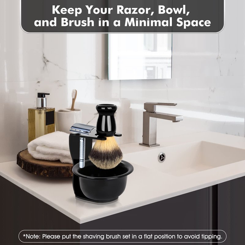 - 🔗【Compact Stand】It has a slot for a razor, and also has room for holding your shave brush and bowl so that your shave kit can fit in a minimal perfect space. You can put them next to the sink for easy use or store them inside a cabinet. The sleek black finish makes the shaving kit for men look elegant and professional, complementing the bathroom decor. Note: Please remove the protective film of the stand before use, and put the shaving bowl and brush set in a flat position to avoid tipping.
