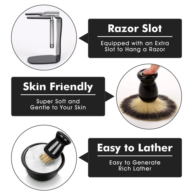 - 🔗【Shaving Brush】The high-quality bristle shaving cream brush without terrible smell is absorbent, super soft to the touch and gentle on the skin. It does a good job of working with all shaving soaps, foams, gels or creams to quickly generate rich lather and apply evenly across your face for a wonderful wet shaving experience. Not only is it easy to use, but it's easy to clean. Note: It is normal for shave brush to have slight shedding of bristles during the first few uses.