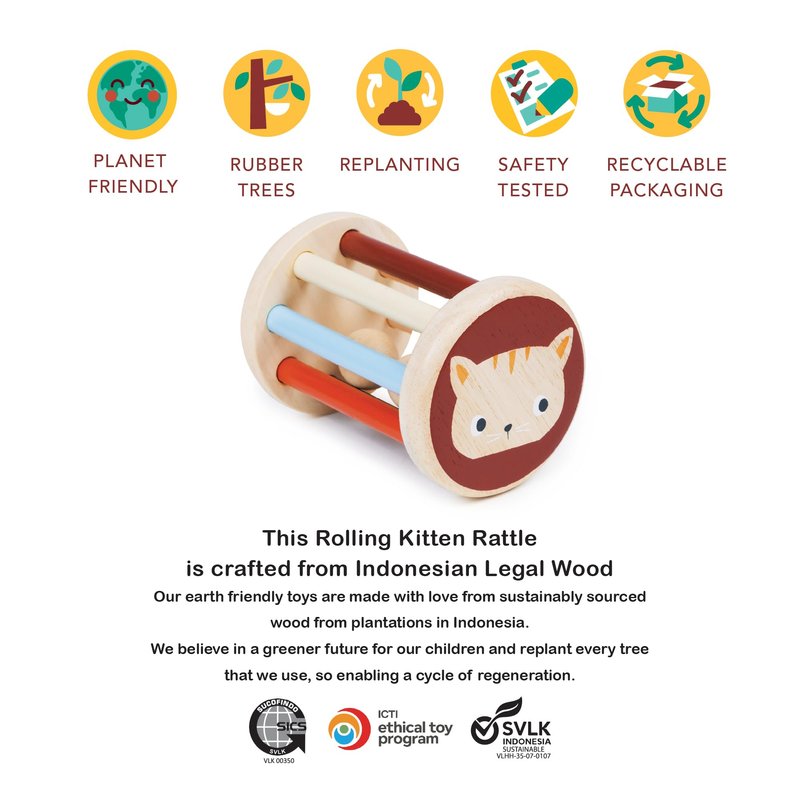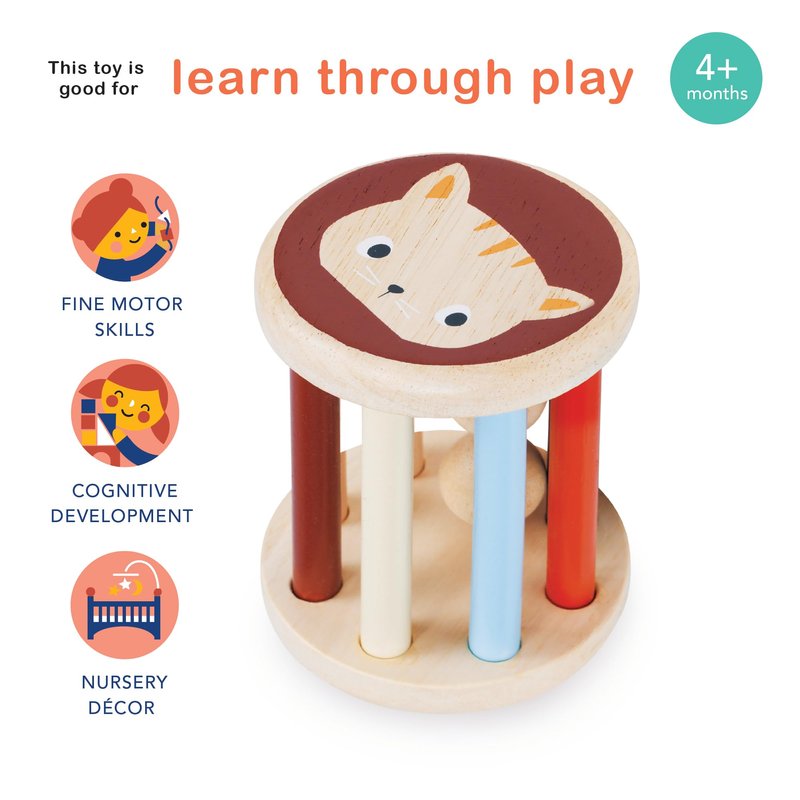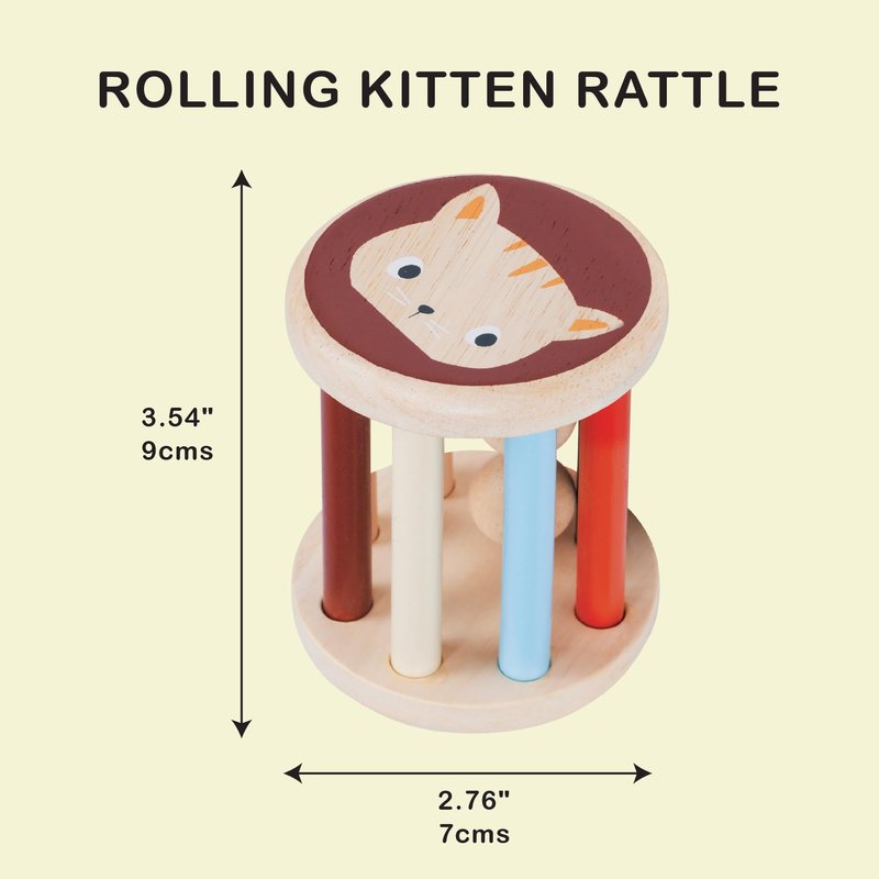- SHAKE, RATTLE AND ROLL - Rolling Kitten Rattle features two smooth wooden balls nestled inside, creating delightful sounds with every shake and roll. The softly colored and natural wood rods are perfectly spaced and sized for tiny hands to grasp, encouraging babies to shake, reach for, and crawl towards the toy.
