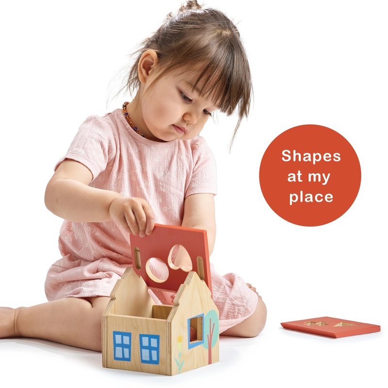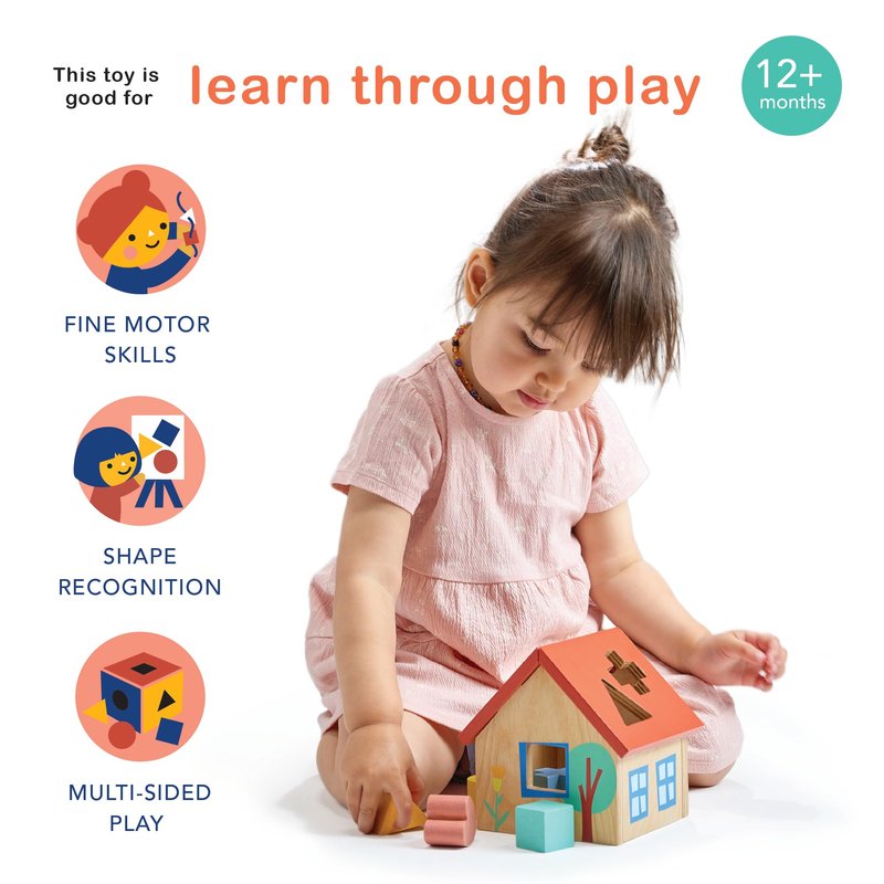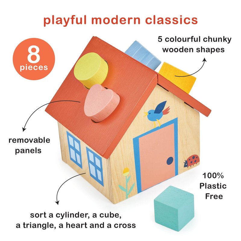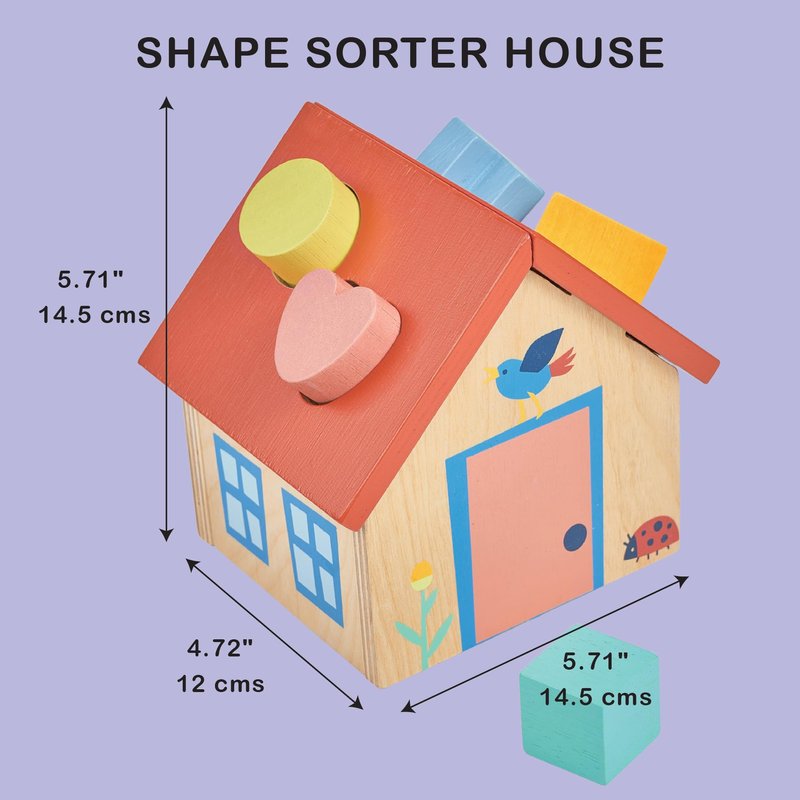 - SHAPE SORTING FUN - Welcome to the cutest little house on the block! Our Shape Sorter House is a delightful wooden toy with a bright red roof and 5 chunky shapes to sort: a cylinder, cube, triangle, heart, and cross. Perfect for little hands and curious minds, this toy keeps the fun rolling from 12 months up. Removable panels make finding those shapes a breeze!