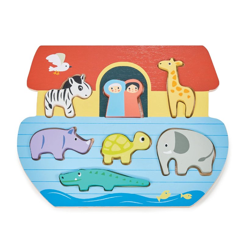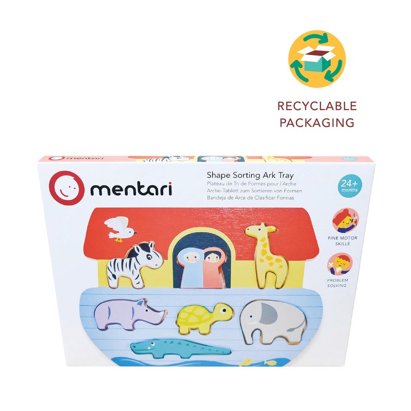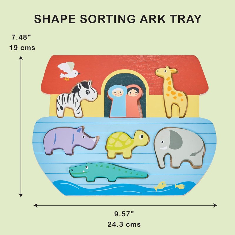 - DISCOVER, MATCH, EXPLORE - Welcome aboard the Shape Sorting Ark Tray, where fun meets learning in a delightful journey straight from Noah’s Ark! This captivating shape-sorting puzzle features six colorful, illustrated animals, along with the charming Mr. and Mrs. Noah, ready to be sorted and placed into their corresponding shapes on the beautifully illustrated ark tray.
