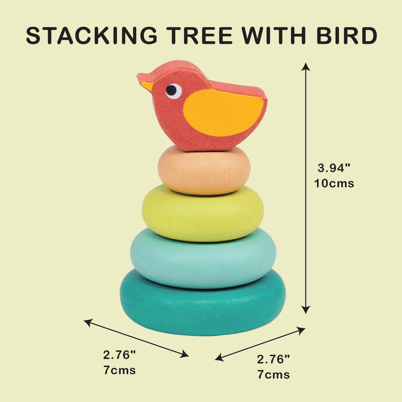 - NATURE INSPIRED STACKER - Our Stacking Tree with Bird is a nature inspired take on the classic stacking tower toy. Your little one can perch the bird on the top of the tree once they have stacked the three smooth, easy-to-grasp rings on their base. The solid rubber wood pieces are stained with fun shades of green to add pops of color.