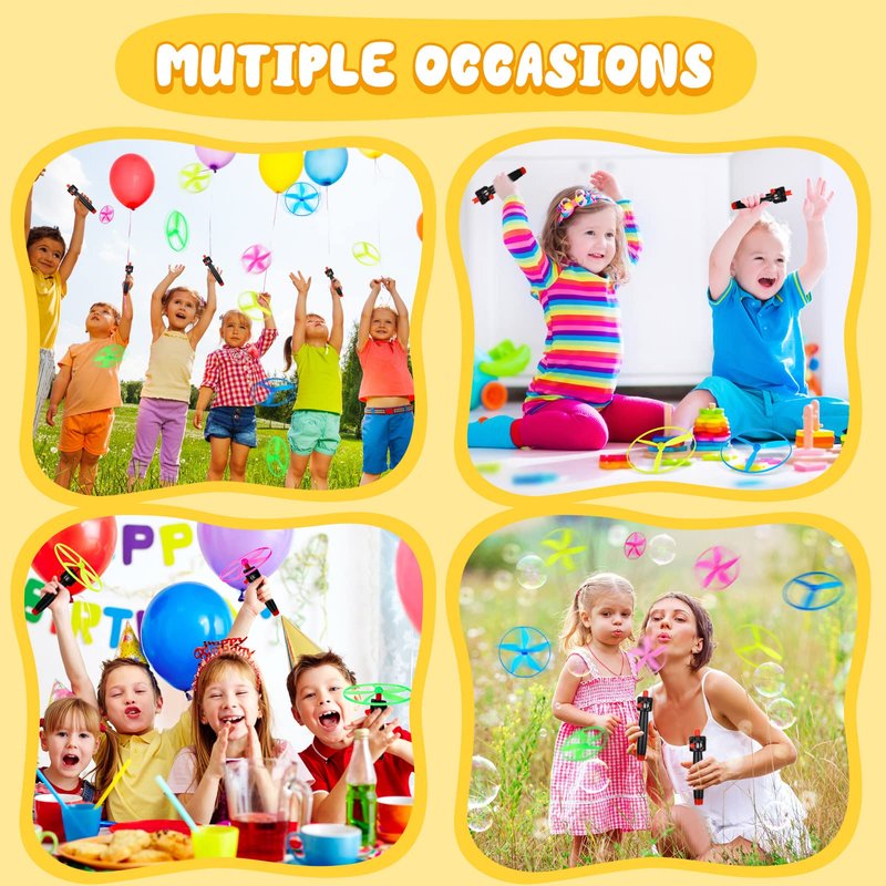 - Package List: you will be given 36 pieces of flying toys, composed of 12 string launchers and 24 flying saucers with 2 sizes (each launcher is equipped with 2 flying saucers with random colors), simple and interesting to play, enough for you to share with playmates