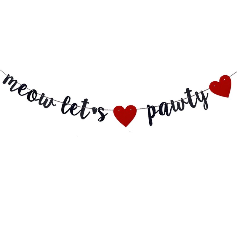 Meow Let's Pawty Banner Black Glitter , Pet Kitty Birthday Wedding Anniversay Party Bunting Sign, Cat Birthday Banner, Kitten Theme / Baby Shower / Cat Pet Birthday Party Supplies Pre-strung