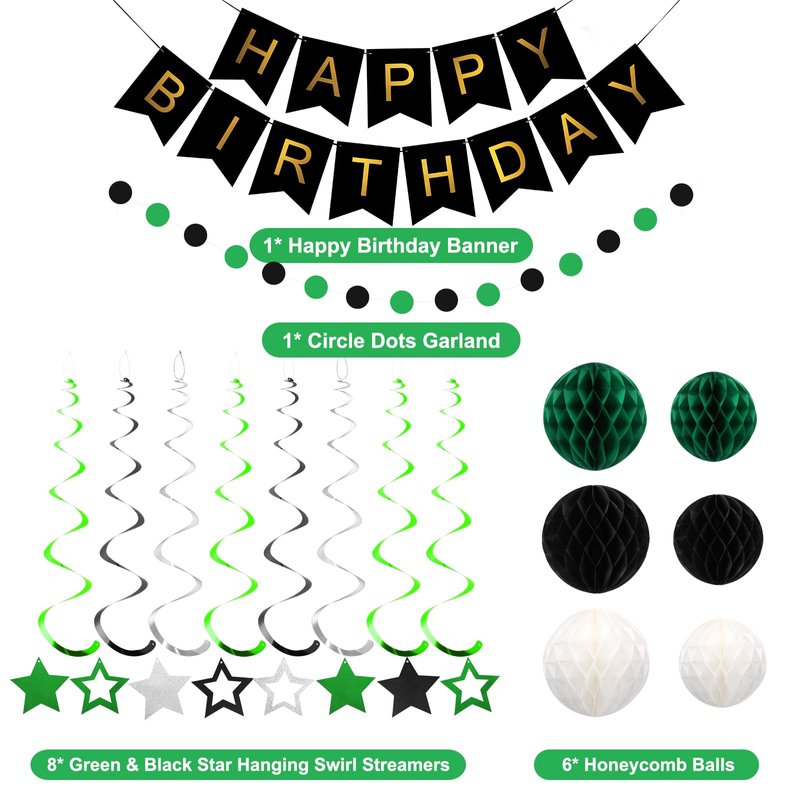 meowtastic Birthday Decorations, Happy Birthday Banner with Honeycomb Balls, Star Hanging Swirl Streamer, Circle Dot Garland, Happy Birthday Party Decorations for Women Men Boys Girls (Green & Black)