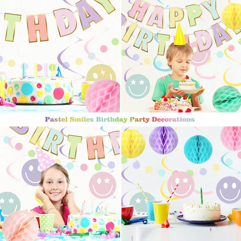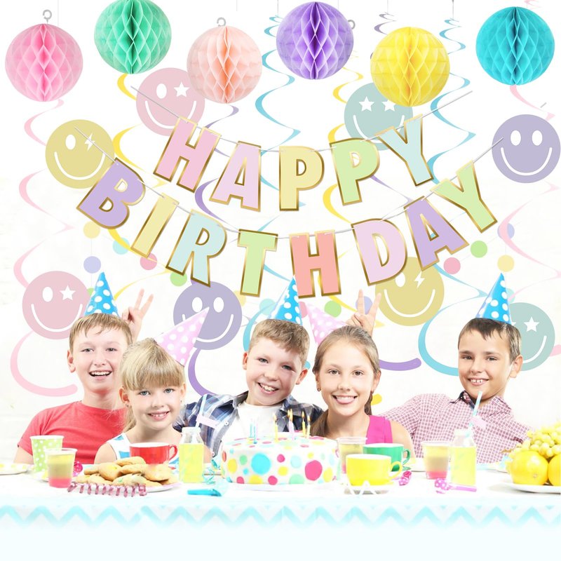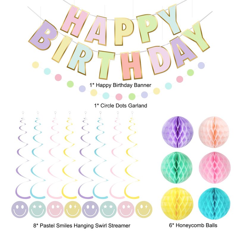 - Package Including: With our Birthday Party Decorations package, you'll have everything you need to create the perfect party atmosphere. You can get 1pcs Happy Birthday Banner, 6pcs Honeycomb Balls, 8pcs Smiley Face Swirls Streamers, and 1pcs Circle Dots Decorations. No need to worry about running around and finding individual items. It's convenient package.