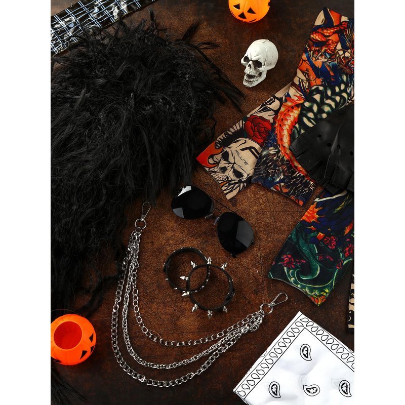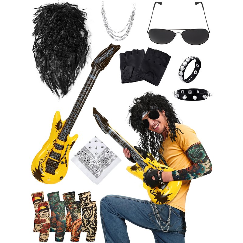 - punk halloween Costume accessories: you will get 1 curly wig, 1 80s headband, 1 sunglasses, 1 pair of motorcycle gloves, 4 fake arm tattoo sleeves, 1 black pants chain, 1 inflatable guitar and 1 pair of punk bracelets, a nice combination to meet your use