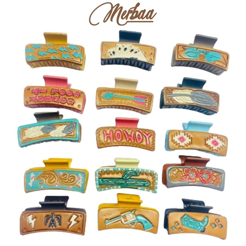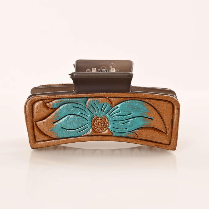 Merbaa Western Cowgirl Stuff Women's Leather Prairie Sunrise Claw clip 3.5" Rectangle Jaw Cowhide Hand Tooled Leather Patch Clips for Thick, Long, Short, Curly Hair Cowboy Fashion Claw Clip