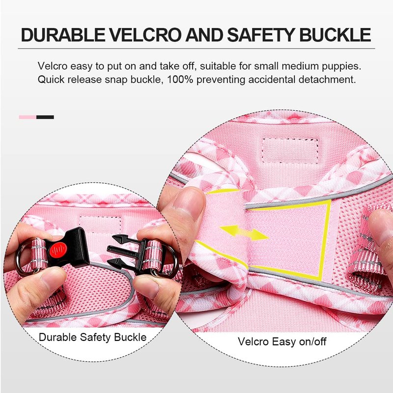 - 【Easy to use & Quick release】- Our Step-in harness is very easy to put on and take off with the fast-release safety buckle. Put the dog's front feet into the holes, close the magic tape fastener, then snap the buckle, attach the leash to D-rings, finished.