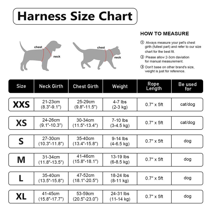 - 【Measure before ordering】- This harness is suitable for small medium dogs and cats, don't purchase based on your old experience, please always measure the widest part of your pet's chest before ordering. If the chest girth is between two sizes, we recommend you to choose the larger size. DON'T CHOOSE SIZE BY WEIGHT ONLY.
