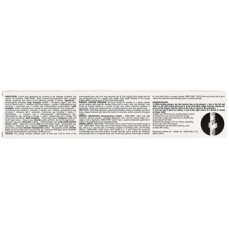 Zimecterin Gold (ivermectin/praziquantel) Paste provides effective treatment and control of the following parasites in horses. Tapeworms-Anoplocephala perfoliata, Large Strongyles (adults)-Strongylus vulgaris (also early forms in blood vessels), S. edentatus (also tissue stages), S. equinus, Triodontophorus spp. including T. brevicauda and T. serratus and Craterostomum acuticaudatum; Small Strongyles (adults, including those resistant to some benzimidazole class compounds)-Coronocyclus spp. including C. coronatus, C. labiatus and C. labratus, Cyathostomum spp. including C. catinatum and C. pateratum, Cylicocyclus spp. including C. insigne, C. leptostomum, C. nassatus and C. brevicapsulatus, Cylicodontophorus spp., Cylicostephanus spp., including C. calicatus, C. goldi, C. longibursatus and C. minutus and Petrovinema poculatum; Small Strongyles-Fourth-stage larvae; Pinworms (adults and fourth-stage larvae)-Oxyuris equi; Ascarids (adults and third-and fourth-stage larvae)-Parascaris equorum; Hairworms (adults)-Trichostrongylus axei; Large-mouth Stomach Worms (adults)-Habronema muscae; Bots (oral and gastric stages)-Gasterophilus spp. including G. intestinalis and G. nasalis; Lungworms (adults and fourth-stage larvae)-Dictyocaulus arnfieldi; Intestinal Threadworms (adults)-Strongyloides westeri; Summer Sores caused by Habronema and Draschia spp. cutaneous third-stage larvae; Dermatitis caused by neck threadworm microfilariae, Onchocerca sp.
