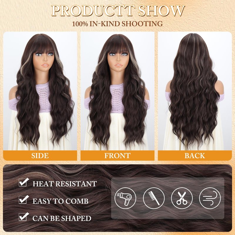 - 【Unique Style】This long brown highlight wavy wig is soft, full and thick. 26-inch long curly hair with bangs, very flattering to the face and easy to manage. Its natural waves and stylish look help you change your style and become more confident and attractive.