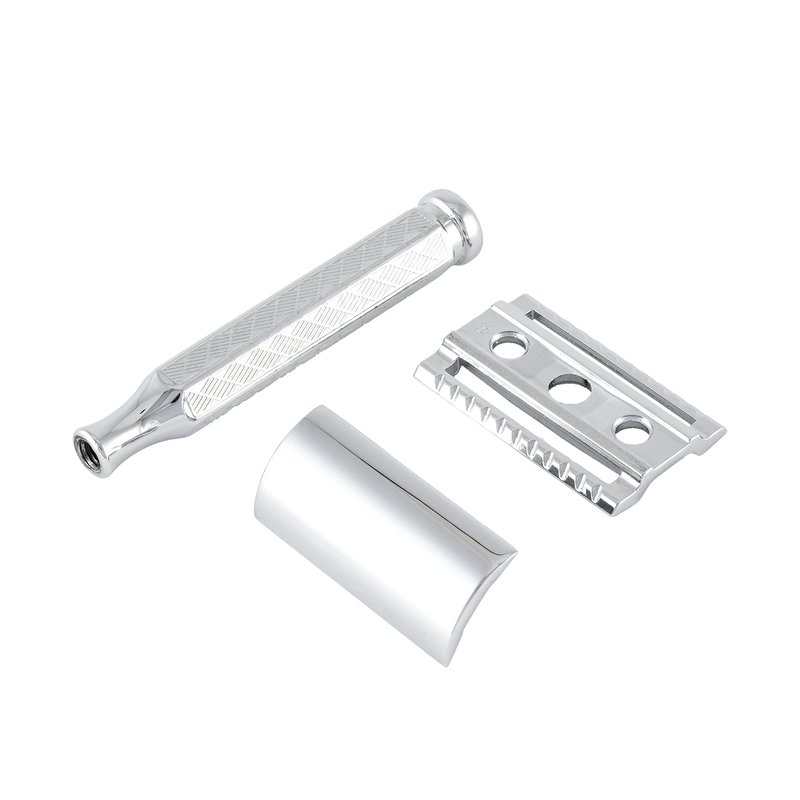 - The head of the safety razor is manufactured using the zinc die-casting process since it creates instruments with maximum precision even for complex shapes. In order to ensure a comfortable weight distribution, we only use brass for the handle. The chrome finish protects the razor from corrosion and underlines the high-quality design.