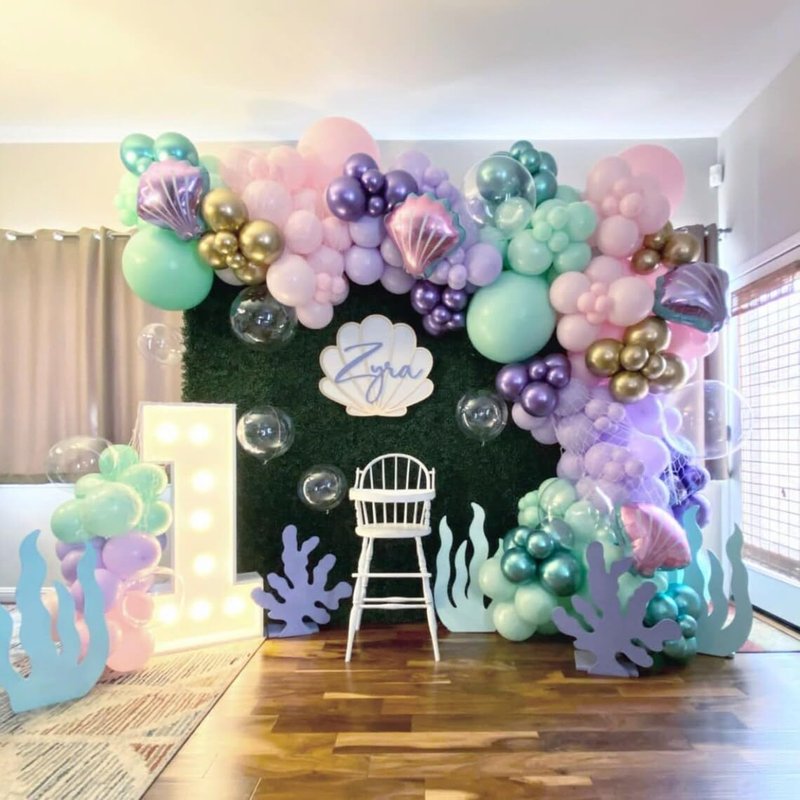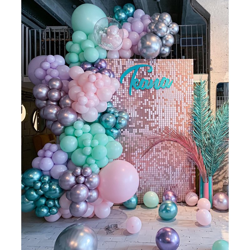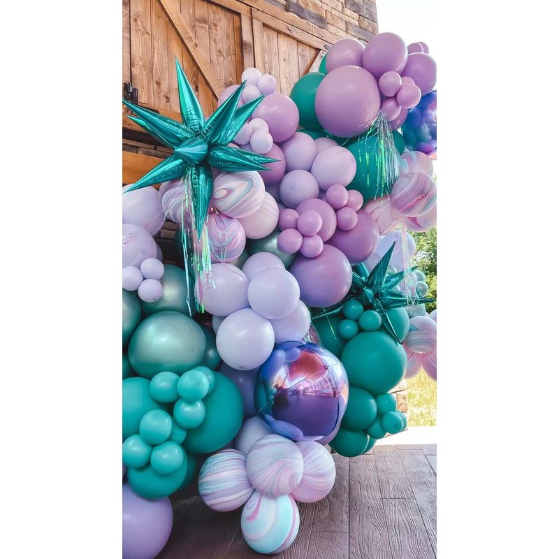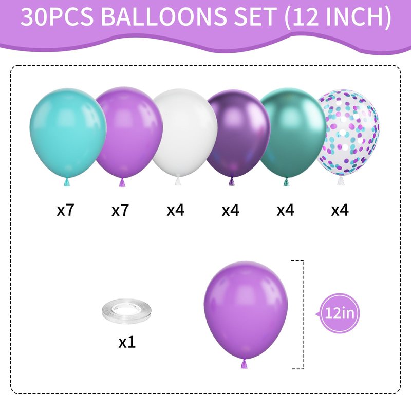 - 12 Inch mermaid balloons: Package content includes 7 pcs teal balloons, 4 pcs confetti teal purple Balloons, 4 pcs metallic green balloons, 4 pcs metallic purple balloons,7 pcs purple balloons,4 pcs white Balloons, a balloon ribbon.