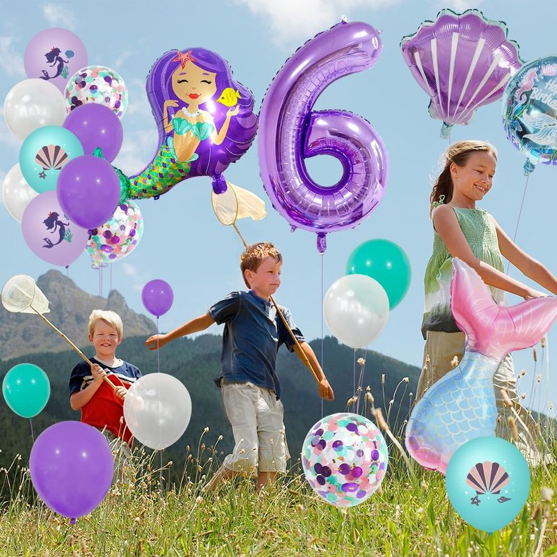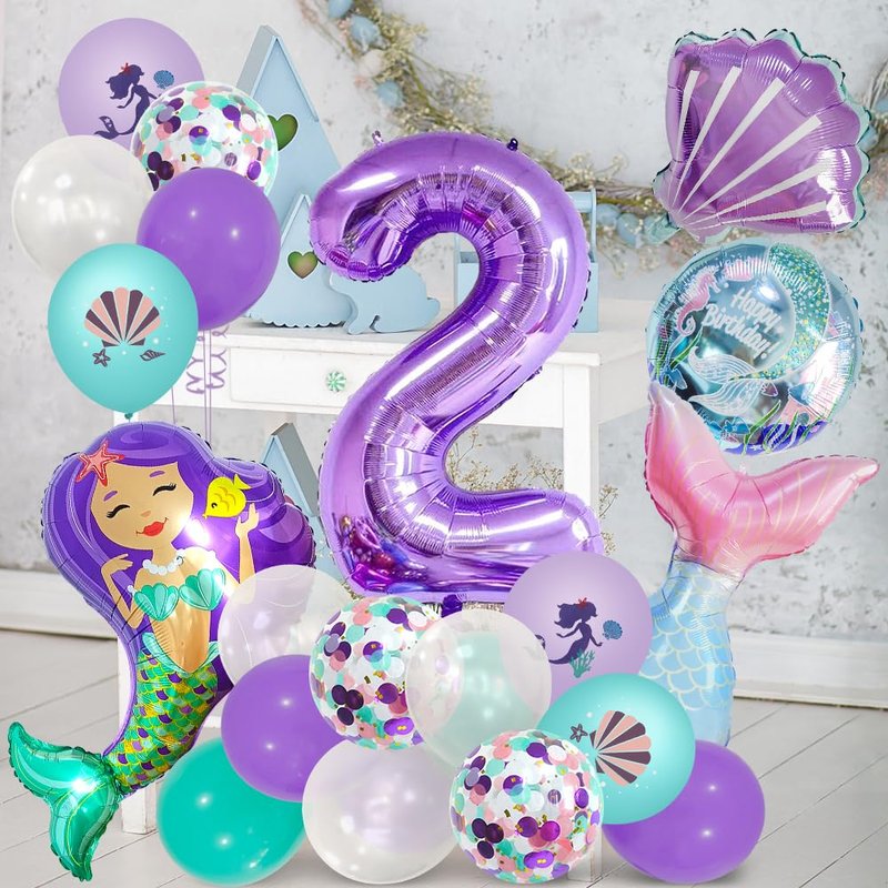 - Design:1* 40 inches Number Foil Balloon,1* 30 inches Mermaid Foil Balloon,1* 31 inches Mermaid Tail Foil Balloon,1*18 inches "Happy Birthday" Printed Foil Balloon,1* 18 inches Sea Shell Foil Balloon,2*12 inches Mermaid Printed Latex Balloons,2*12 inches Seashell Printed Latex Balloons,3*12 inches Latex Confetti Balloon,4*12 inches Purple Latex Balloons,4*12 inches White Latex Balloons,2*12 inches Blue Latex Balloons,2*5 meter Purple Ribbon,20*Glue,1*Straw