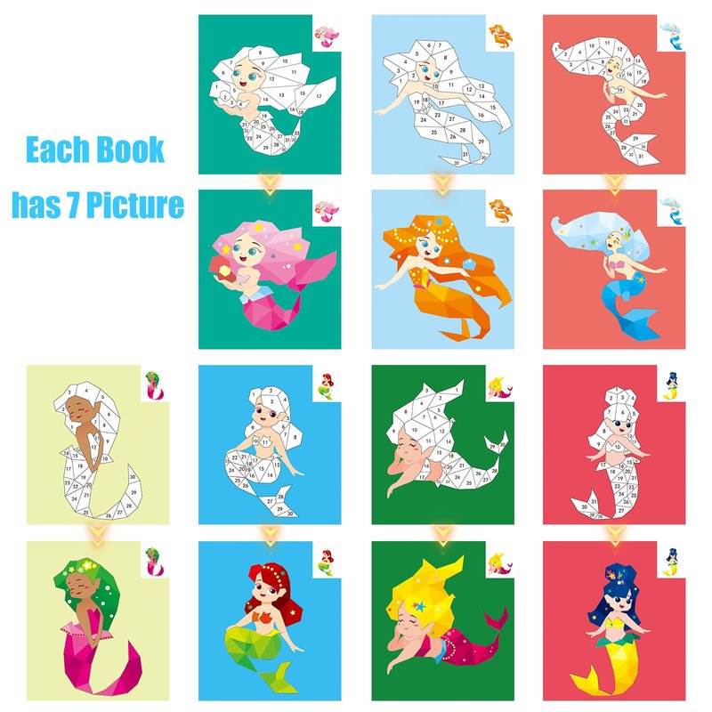 - 【Sticker Books for Kids Ages 4-8】: Package includes 1 Pack Mermaid sticker paint book, total 7 sheets of stickers. Each sticker book has 7 different picture pages, can be finished 7 pictures in total. Sticker book and Sticker Sheets are Separate. It’s easy to share with your friends.