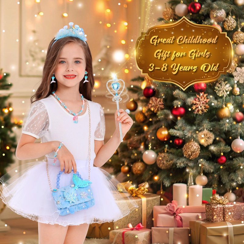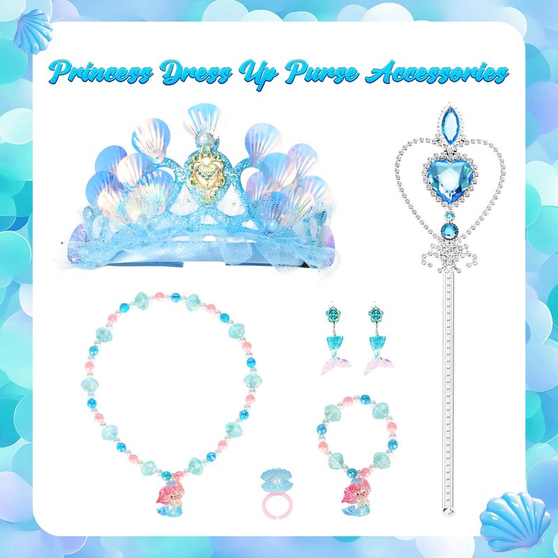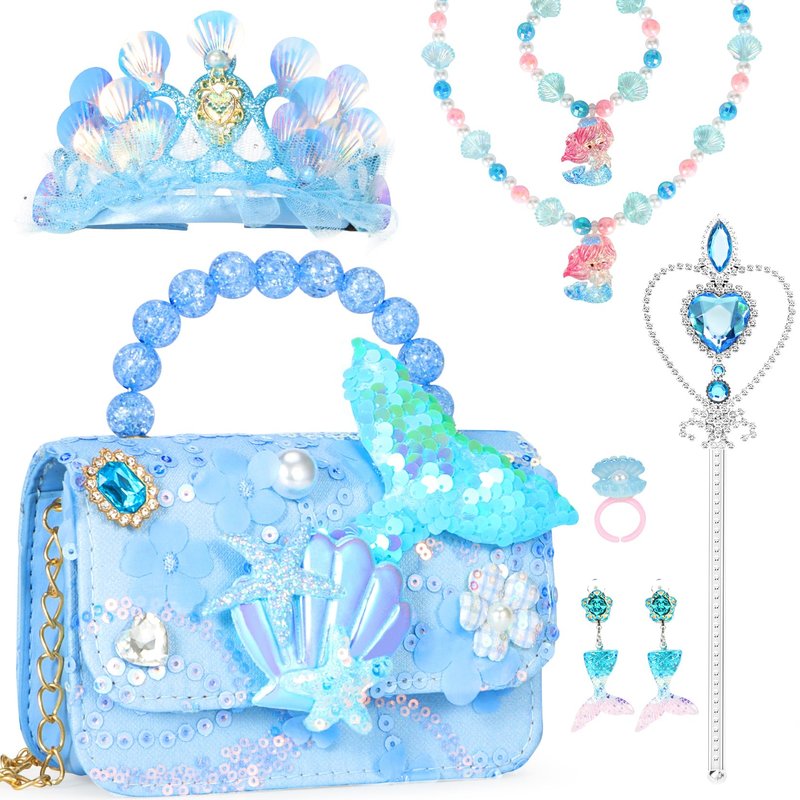 - Princess Purse Gift Set includes 1 mermaid handbag, 1 mermaid princess crown,1 necklace, 1 bracelet, 2 earrings, 1 ring and 1 magic wand. Each piece is beautifully designed, idea gift for girls 3-8 years old.