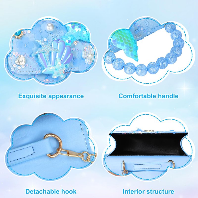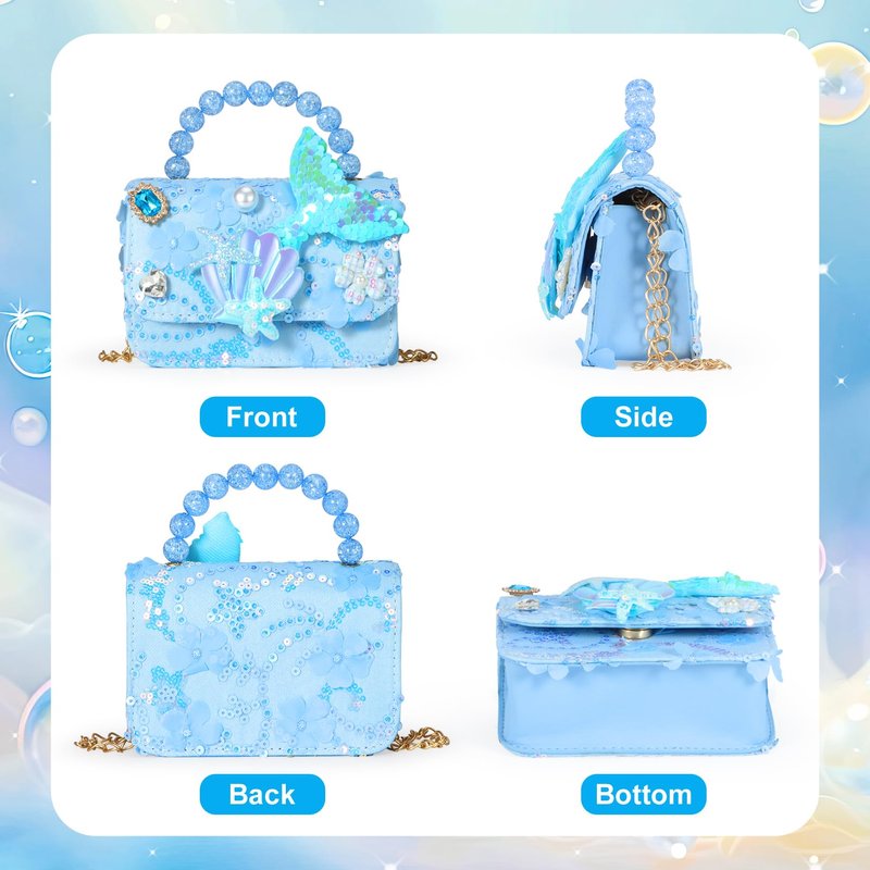 - Mermaid play purse: The play purse is mermaid-themed, combining gradient sequins, mermaid tails, starfish and shells,creating a unique fairy tale dream style, Let the little princess feel the mermaid world in the fairy tale.