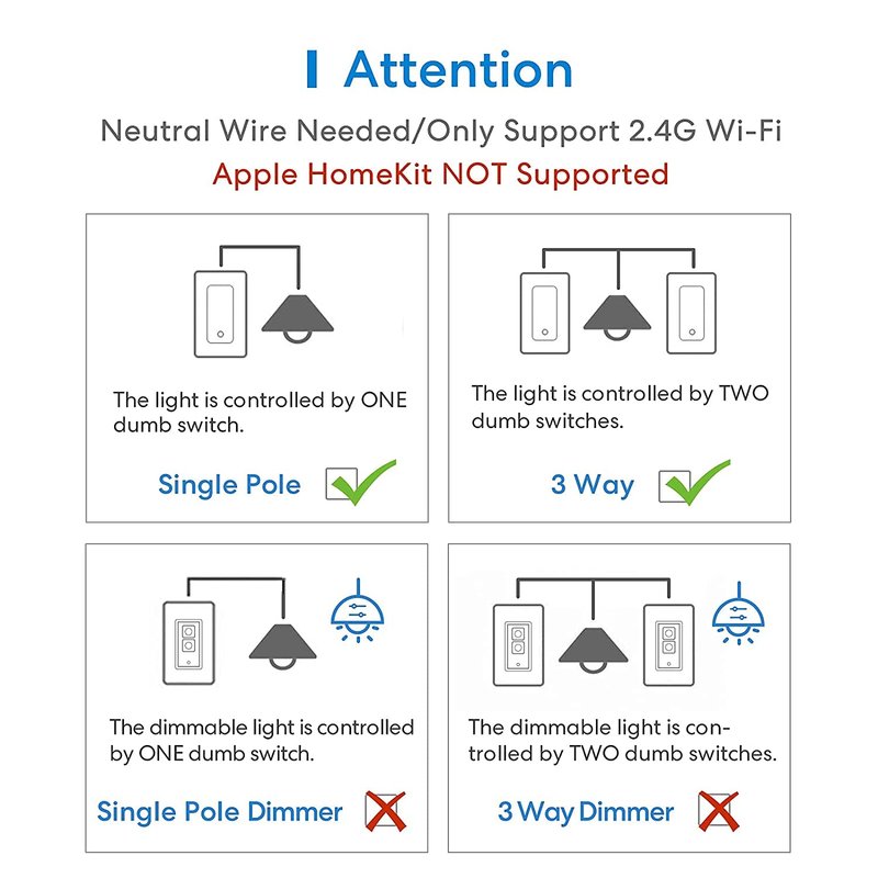 - Just Replace One Traditional 3 Way Switch: No need to replace two traditional 3 Way switches, just replace one traditional 3 Way switch and save 50% of money.Note: this smart switch is only for non-dimmable lights, 2.4GHz Wi-Fi network support only.