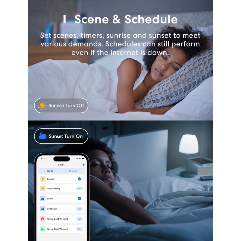 - Schedules and Energy Saving: You can set schedules (timers) to turn on/off your smart rgb light automatically based on your routine. Sunrise/sunset mode supported. Only 9W of energy consumed, equivalent to the brightness of a 60W incandescent bulb, saves up to 8.19 $ per year