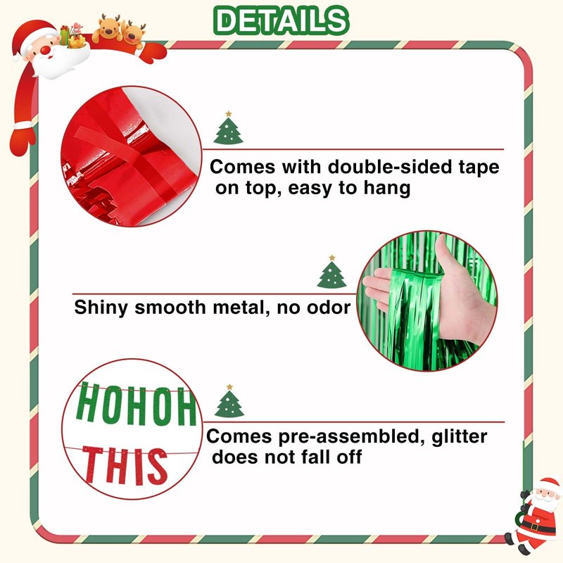 - Multi-Occasion Decor:Our red and green holiday decor with Christmas hats paper garland are suitable for December 2024 party decorations, Xmas dinner party decorations, holiday party decorations, Christmas birthday celebrations, 2025 new years eve party supplies, baby shower party, bridal shower party, wedding, and shiny fringe curtain backdrop.The glitter green and red sign lights up your festival