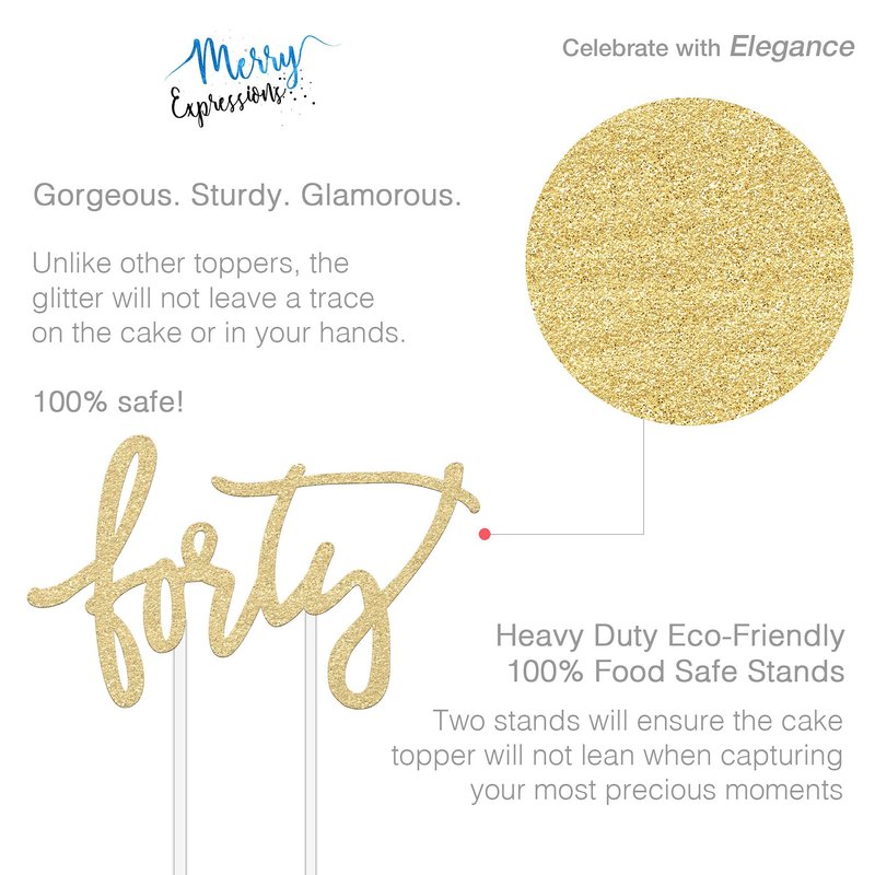 - Designed in the USA - Our 40 topper cake is made with double sided gold glitter. A great addition to your fortieth birthday.