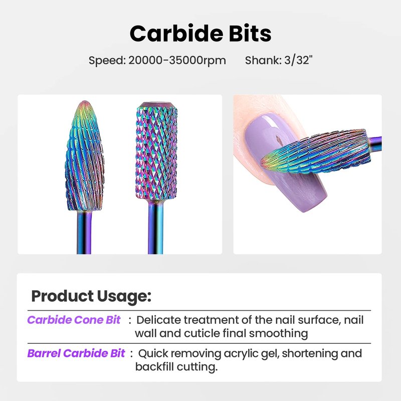 - 【Tungsten Carbide】Hard and durable tungsten carbide nail drill bits for fast and safe gel nail removal.