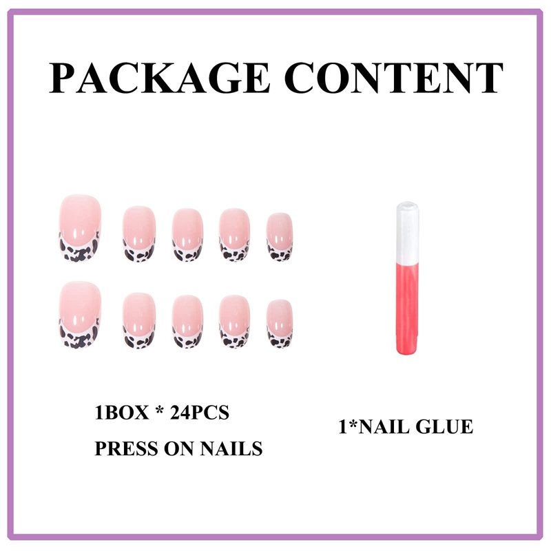 MERVF Short Press on Nails Oval French Tip Fake Nails White Round Glue on Nails with Cow Print Design Glossy 24pcs Artificial Acrylic Nails for Women