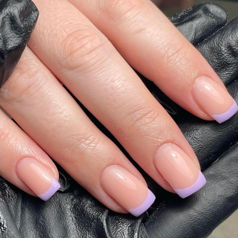 MERVF Short Press on Nails Square Fake Nails Purple French Tip Squoval Glue on Nails with Design 24pcs Glossy Artificial Acrylic Nails for Women
