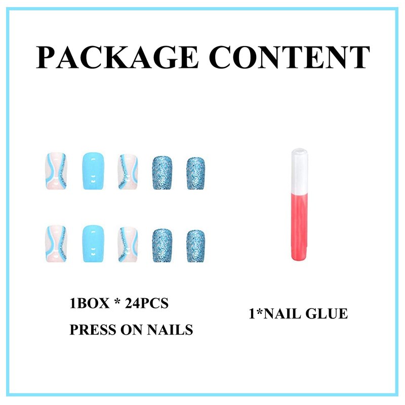 MERVF Square Press on Nails Medium Fake Nails Blue White Squoval Acrylic Nails with Glitter Lines Design 24pcs Glossy Neon Glue on Nails Press ons