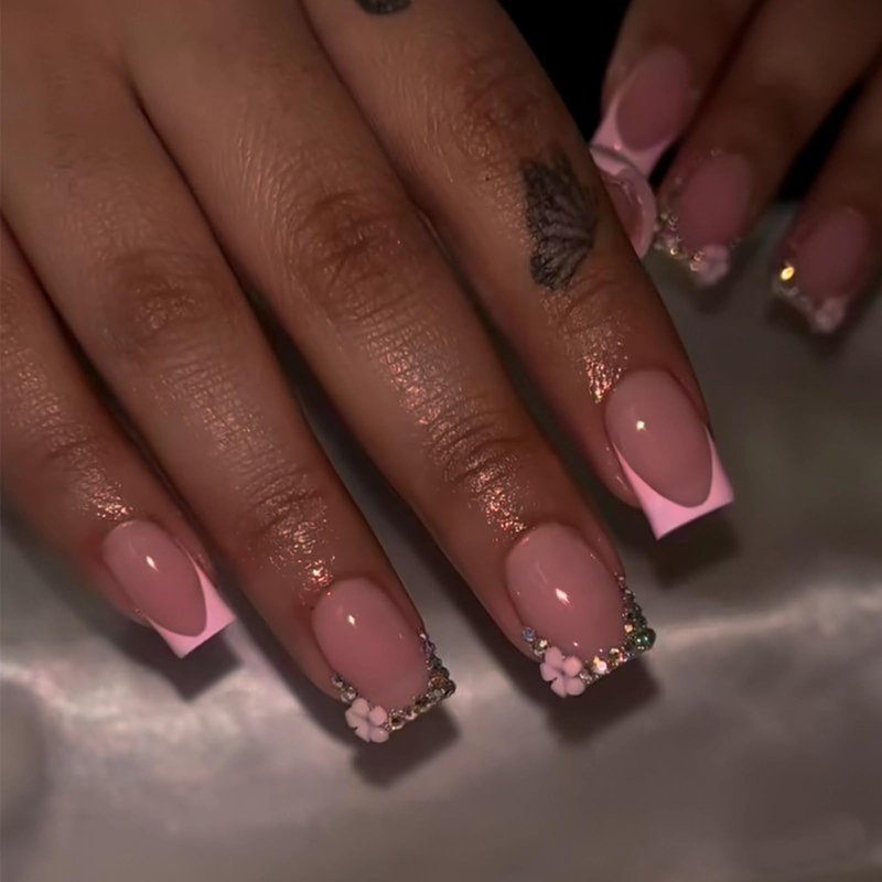 MERVF Square Press on Nails Medium Fake Nails Press ons Pink French Tip Glue on Nails with Rhinestones Design Squoval Flower Acrylic False Nails Glossy 24pcs