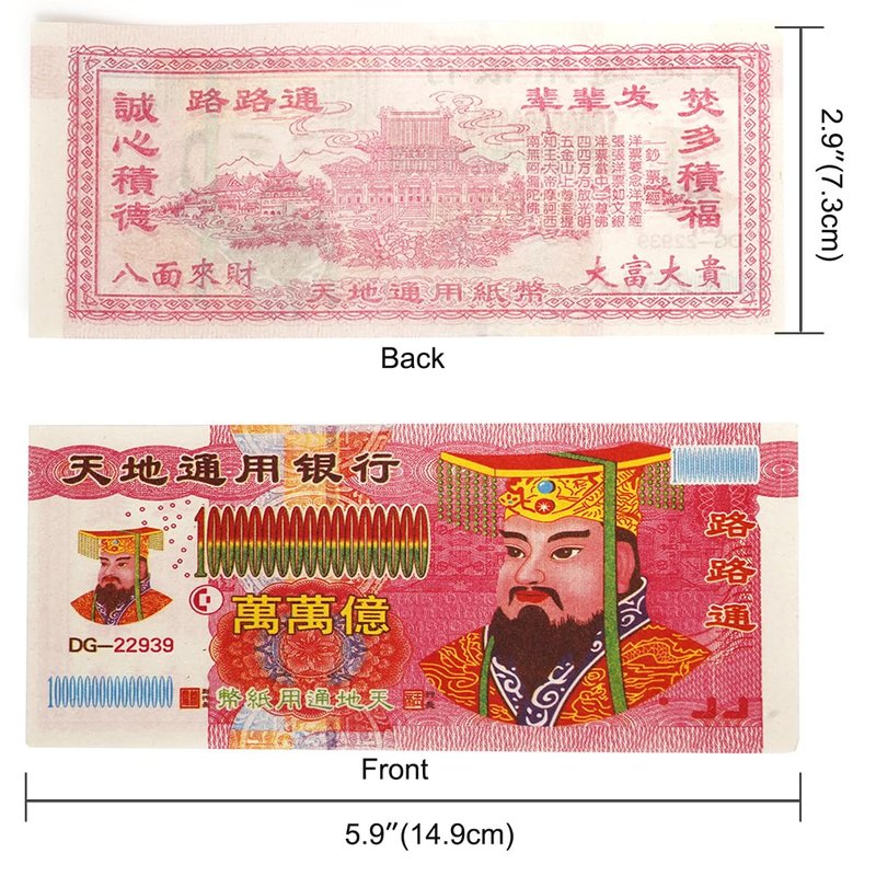 These hell bank notes feature an image of the Jade Emperor, the presiding monarch of heaven in Taoism. Traditional paper money is divided into two types, one is used to worship gods, and the second is used to worship ancestors and ghosts. Used this to send money to your Ancestor so she have a better life with all the ancestors.It's a tool that allows us to take care of ancestors, in return, they take care of us, and bring you good luck.