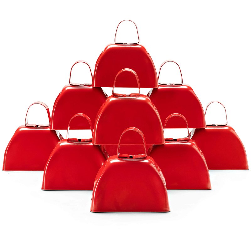 - PACK OF 12. 3" METAL COW BELLS: Get ready to make some noise with this bulk pack of 12 cow bells. Each set includes a total of 12, Red 3 Inch Metal cow bells with top handles. These cow bells are great to customize or decorate and make your own by painting or applying vinyl decals