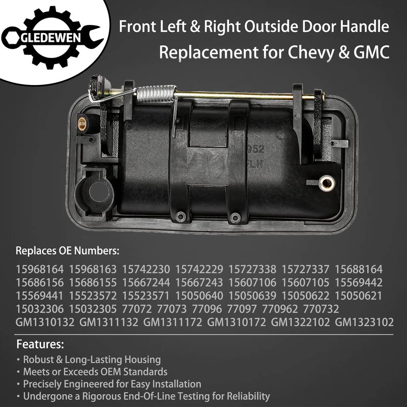 - 【Replace OE Number】15968164,15968163,15742230,15742229,15727338,15727337,15688164,15686156,15686155,15667244,15667243,15607106,15607105,15569442,15569441,15523572,15523571,15050640,15050639,15050622,15050621,15032306,15032305,77072,77073,77096,77097,770962,770732,GM1310132,GM1311132,GM1311172,GM1310172,GM1322102,GM1323102. Direct fit OE replacement exterior door handle, which is easy to install wihout modifications needed for installation.